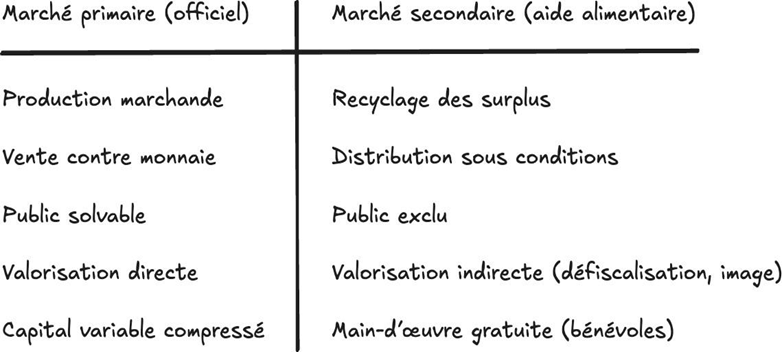 Cette contradiction – abondance et exclusion – n’est pas un simple accident ou un dysfonctionnement, elle relève d’une logique structurelle propre au capitalisme : produire pour accumuler du capital, non pour satisfaire des besoins. Cela explique pourquoi, en parallèle de ce marché primaire saturé, s’est développé un circuit secondaire, celui de l’aide alimentaire. Non pas en rupture avec l’économie de marché, comme on se le représente parfois, mais comme son prolongement nécessaire.