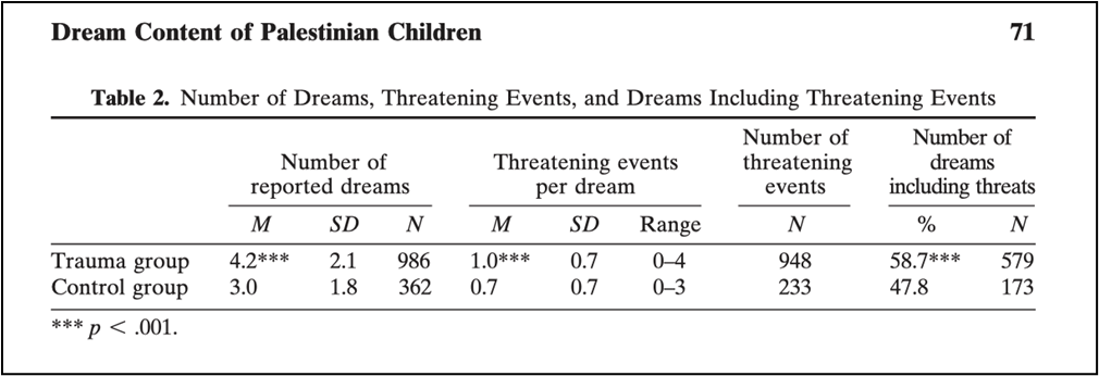 Valli Katja. « The Effect of Trauma on Dream Content—A Field Study of Palestinian Children », Dreaming, 2006, p. 76.